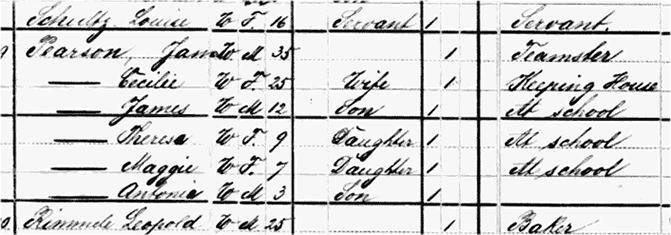 James Pearson is a teamster. His wife Cecilie, nicknamed Celia, keeps house. She is just pregnant with Leopold Leander Pearson, our ancestor, who will be born February 4, 1881 and go on to have eight children of his own, the second a girl, Marian Margaret Pearson.